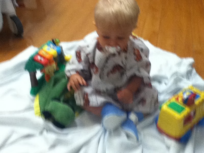 About 2 weeks ago Colson had his appointment with the ENT doctor. Colson did not have an ear infection at the time, but testing showed there was fluid in both ears, his right more so than left (his right ear is always worse with infections). We did a hearing test too and he can hear just fine, so that was relief. We decided that we would go ahead and put the tubes in due to how severe his ear infections have been. Also, cold and flu season is coming quickly, but this should be the time of year that kids are the healthiest. The doctor ultimately left the decision up to me, so hopefully I made the right one. Colson and I got up early today and headed into OSF Center for Health. He couldn't eat in the morning and I was worried that he'd be beastly the hour before surgery, but he was such a good boy! He was the only baby (there were at least 4 others that I saw) that was crawling all over the waiting room like crazy and throwing the magazines off the table, but hey-he was happy! In pre-op we put on his gown and little footies and he played with some toys the nurse brought back.